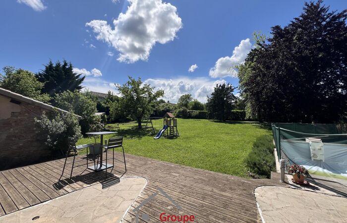 Le tout est implanté sur un terrain clos et arboré de 1 665 m² avec une piscine (à rénover) pour profiter pleinement de l’extérieur.